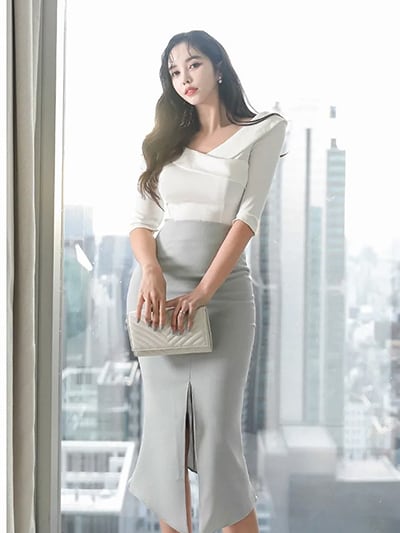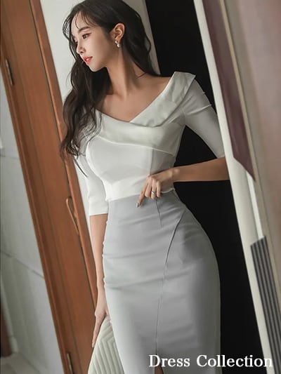 バイカラーがおしゃれなマーメイドラインの人気ワンピースです。