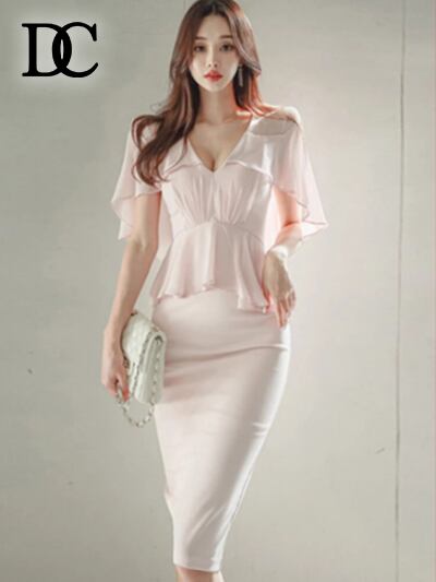 《プチプラ》フリル付きVネックペンシルドレス/キャバドレス